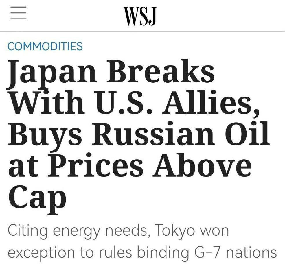 The Wall Street Journal пишет, что Япония продолжила закупки российской нефти, не смотря на то, что присоединилась к санкциям в том числе по так называемому "потолку цен", который установлен на уровне не более 60 долларов за баррель российской нефти.