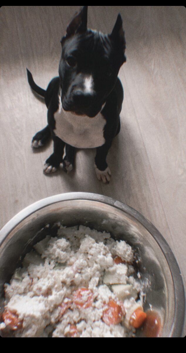 Продолжим тему питания. Напомню,что при покупке щенка,мы придерживались мнения,что собака должна кушать правильно. Для нас правильно,это было натуральное питание. И до определенного возраста и момента,у нас отлично получалось☺️ К примеру на фото: Порция творога,для нас это было 300 гр где-то ; натуральный йогурт немножко совсем ; фрукты и овощи 😊