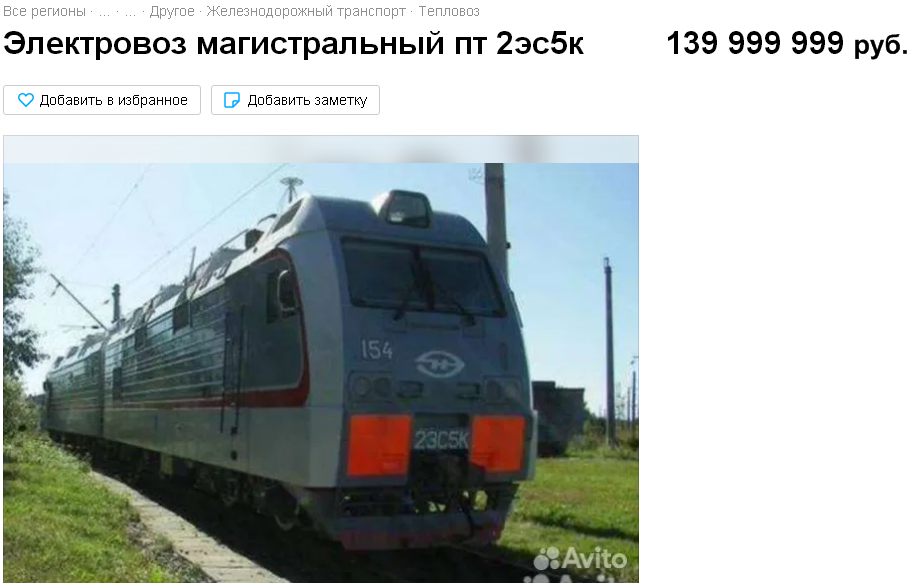 Когда речь заходит о локомотивах, будь то электровозы или тепловозы, то мало кто говорит о ценах на них. А ведь на самом деле они стоят довольно дорого, причём их выставляют на продажу через Авито как и весь остальной транспорт. И даже несмотря на то, что физлица в России фактически не имеют возможности рассекать с ветерком на собственном локомотиве по ж/д путям общего пользования, наверняка многим будет интересно узнать, почём в России продают локомотивы. В покупке такого вида транспорта потенциально могут быть заинтересованы транспортные и логистические компании, которые имеют лицензию от РосЖелДора и РосТрансНадзора на ж/д транспортировку грузов. Так например самый дорогой локомотив, который выставлен на продажу, стоит почти 140 млн. руб.: Это магистральный грузовой двухсекционный электровоз переменного тока "Ермак". Получается, что одна секция стоит 70 млн. руб. Но скорее всего вариант, типа, "можно я сначала куплю одну секцию, и если понравится, то потом докуплю и вторую" не прока