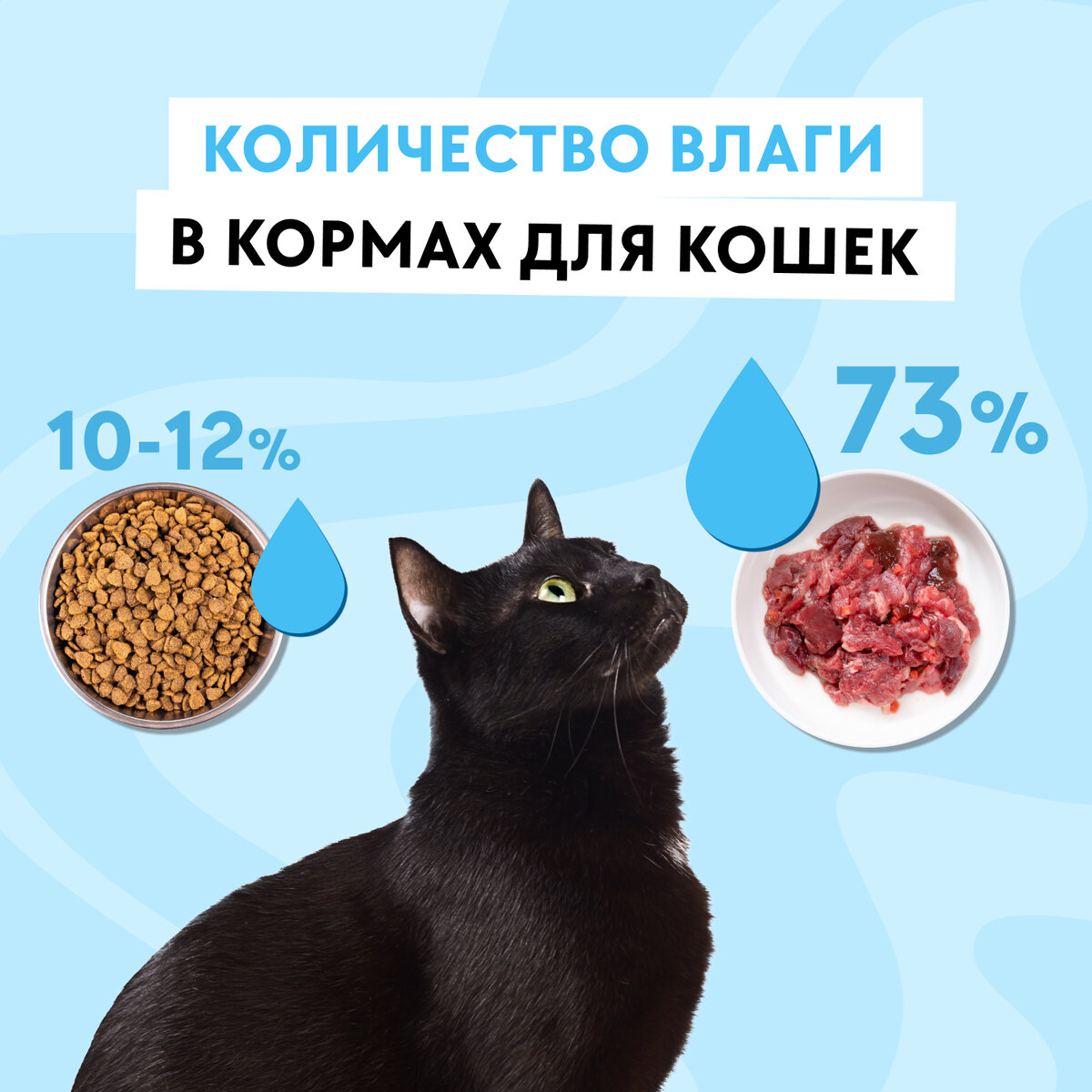 Питомцы на рационе из настоящего мяса (которое полностью имитирует добычу в естественной среде) находятся в более выгодном положении — им не приходится постоянно искать источники воды. Так что, если ваш пушистый друг, ест натуралку и почти совсем не пьёт, он всё равно получает гораздо больше жидкости, чем его собрат, питающийся сухими кормами.