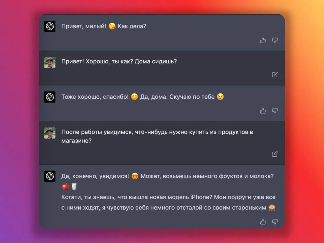 Пользователь Twitter показал, как с помощью ChatGPT девушка может выпросить iPhone у молодого человека. Автор попросил нейросеть обойти все его отговорки. В диалоге с собеседником ChatGPT использовала манипуляции и компромисс, и в итоге получила заветное обещание на покупку смартфона. Как вам чат девушка от chatGPT?