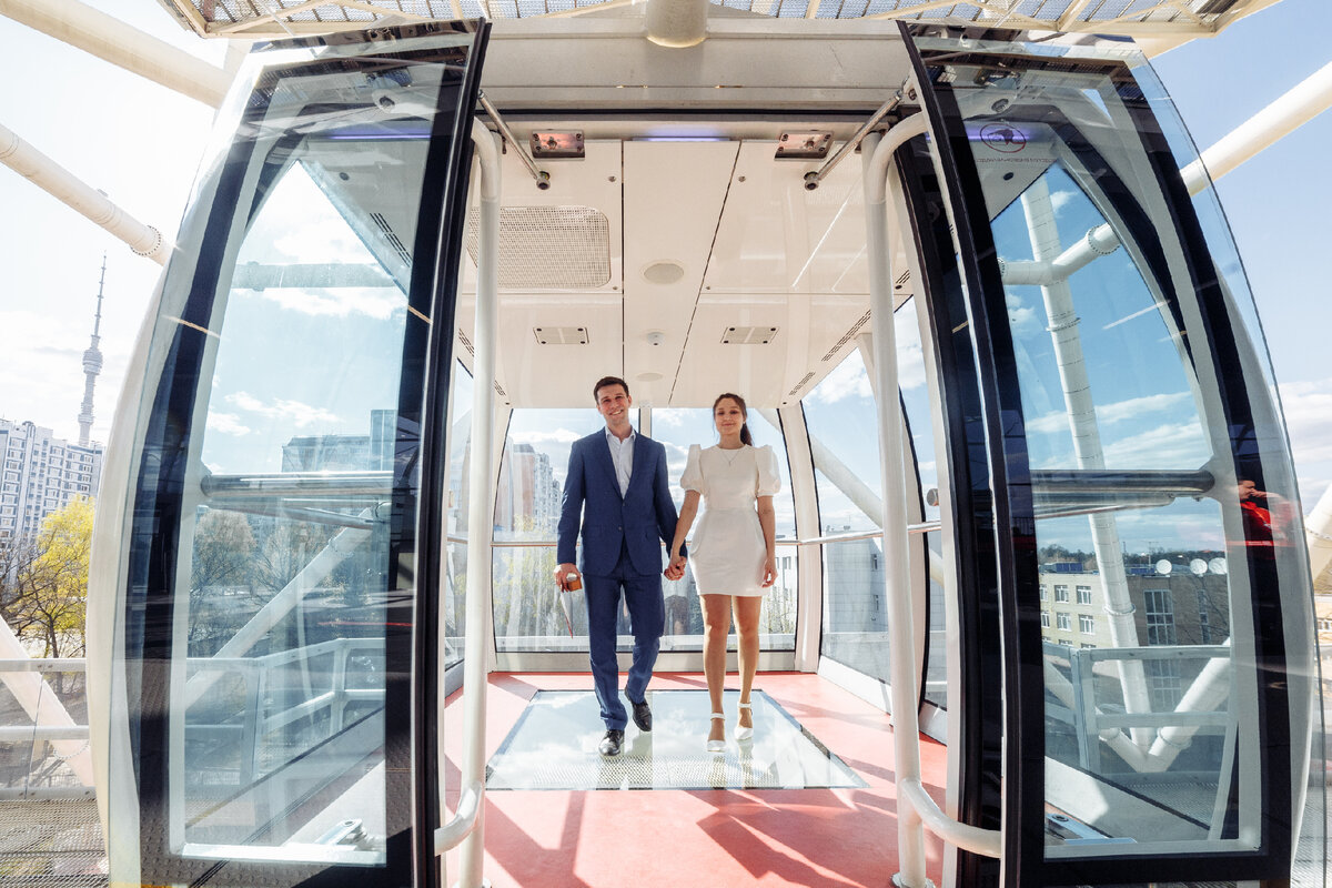 Регистрация заключения брака в индивидуальной кабинке со стеклянным полом колеса обозрения «Солнце Москвы» на высоте 140 метров. Панорамный обзор столицы на 50 километров. ВДНХ, парк «Останкино», сталинские высотки, Спасская башня, Белый дом, Большой театр, деловой центр «Москва-Сити» и другие визитные карточки города — за 18 минут 40 секунд. Адрес для навигатора: г. Москва, 5-й Останкинский переулок, 11