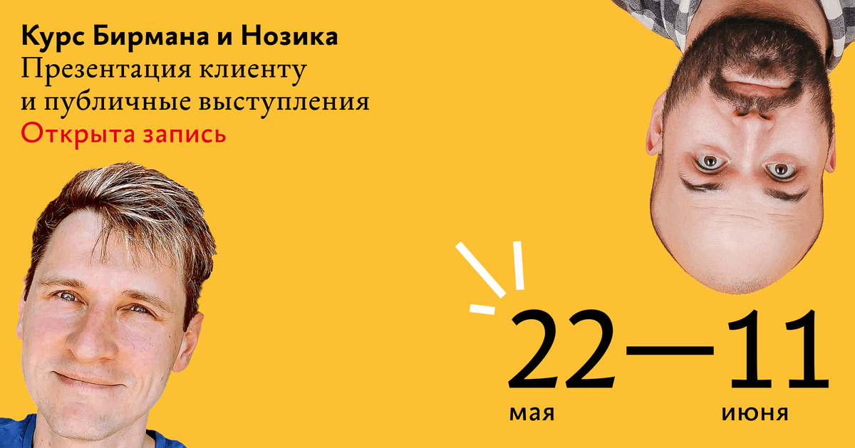 Открыта запись на новый трёхнедельный курс Ильи Бирмана и Миши Нозика «Презентация клиенту и публичные выступления». Курс длится три недели и пройдёт с 22 мая по 11 июня в дистанционном формате. До 22 апреля стоимость ниже на 30%, позднее — участие станет дороже. Успейте записаться! Дизайн, идея статьи или спецпроекта, маркетинговая стратегия, анализ данных, разработка, — результат долгой работы может быть воспринят без энтузиазма, раскритикован, не понят, если его не презентовать. Задача курса — дать специалистам алгоритм публичных выступлений, который поможет не бояться слушателя и сделать презентацию частью рабочей рутины. Илья и Миша — арт‑директора бюро, презентуют и сдают проекты клиентам более десяти лет (часто с первого раза). Илья регулярно выступает на 404фесте, Дизайн‑просмотре и других конференциях. Помимо вдохновения и рекомендаций участники получат практический опыт проведения презентаций: будут выступать друг перед другом и перед преподавателями, ошибаться, получать обра