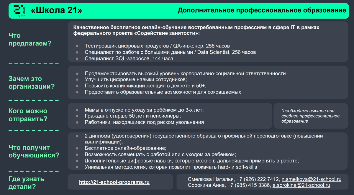 Полезная штуковина для тех, кто грезит IT Информация от коллеги по Ассоциации карьерного консультирования и сопровождения. Если долго вынашиваете мысль по освоению ИТ навыков - это можно сделать в рамках Программы "Содействие занятости" совместно со Школой программирования 21 от СБЕР. Есть возможность БЕСПЛАТНО поучиться и найти работу благодаря новому сертификату ДПО от Школы 21.
