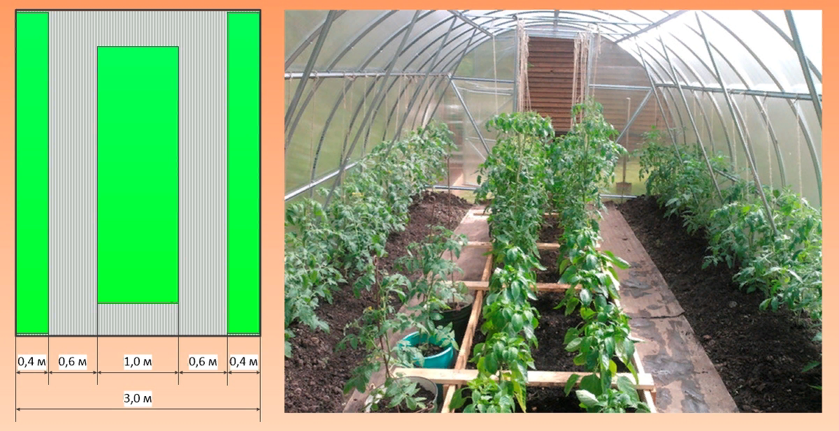 Оптимальным решением считается широкая грядка посередине и две узких у стен. Эргономичным вариантом считается ширина грядки до 120 см. Такой размер дает возможность дотянуться до всех насаждений, не прилагая лишних усилий.