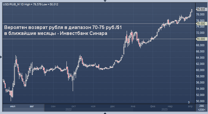 Вероятен возврат рубля в диапазон 70-75 руб./$1 в ближайшие месяцы - Инвестбанк Синара Курс доллар/рубля на Мосбирже интервалами в 1 минуту Курс доллар/рубля на Forex интервалами в 4 часа Главный экономист "Инвестиционного банка Синара" Сергей Коныгин имеет отличную от большинства аналитиков точку зрения, допуская возврат доллар/рубля в диапазон 70-75 руб./$1 в ближайшие месяцы. Невосприимчивость рубля к растущей нефти аналитик объясняет тем, что сейчас не наблюдается активной продажи валюты экспортерами. Для этого нужно время: в апреле или в мае, когда станет работать новая формула расчета цены на нефть для уплаты налогов (с использованием нового нефтяного бенчмарка) и начнет сокращаться добыча. Более того, аналитик ожидает, что в мае Brent подорожает до $100/баррель, а налоги будут уплачены исходя из цены около $75/баррель, что позитивно скажется на рубле. Также он отмечает скачок в объеме торгов валютами дружественных стран; возможно, резко возросла конвертация недружественных валют