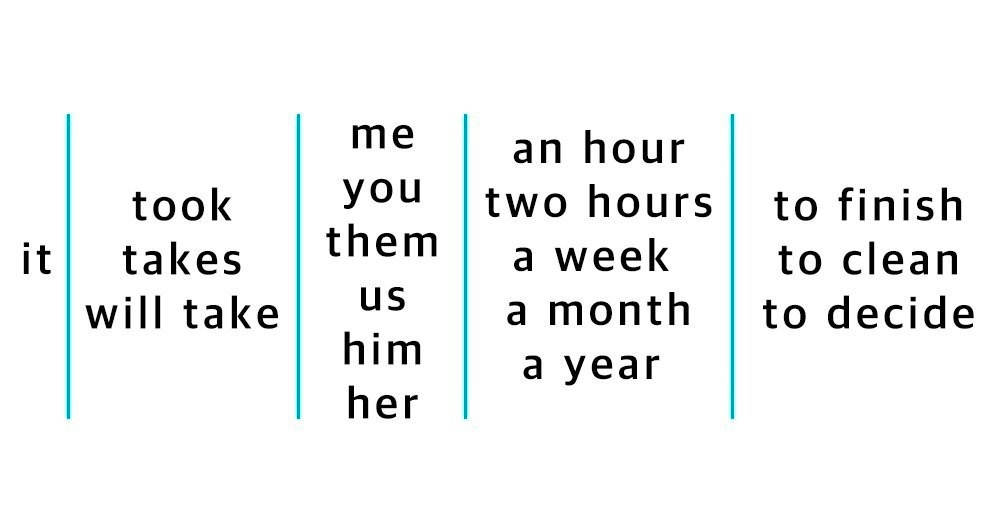 2. теперь берем нужное местоимение, подсмотреть которое можно на картинке снизу. элементарно: it takes me, him, her, them и так далее.