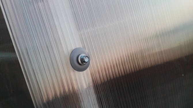Ошибки бывают у всех, вот и нас такая судьба не избежала. Выбрали пластмассовые шайбы под саморез, а когда начали крепить поликарбонат, края шайбы начали рвать его. Чуток перекрутил и вот тебе залом. Пришлось ехать снова в магазин и покупать шайбы с резинкой(кровельные). И все получилось отлично. Главное не перекручивать, держат они превосходно.