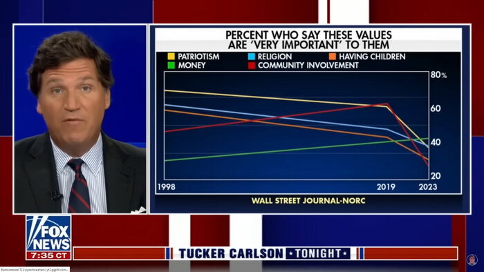 Видео в оригинальном посте. Тут стенограмма для тех, кому удобнее читать, чем смотреть. Дата эфира: 28.03.23. Дата публикации перевода: 02.04.23. Оригинальное видео. Для ЛЛ: рожать - хорошо. Не рожать - плохо. При Байдене в США рожать стали меньше. Следовательно, Джо Байден - плохой. The Wall Street Journal Только что подвела итоги опроса - они столь удручающие, что мы не хотели о них говорить - об изменении настроения американцев. И поражает то, как быстро они изменились, и сколь глубоко. Вот пример: в 98-м 70% американцев заявили, что патриотизм очень важен, теперь так ответили меньше 60%. В том же году более 60% указали, что религия для них очень важна. Этот показатель рухнул ниже 40%. Опрос также показал, что важно для сохранения страны: что важность наличия детей также резко упала, и это фундаментальное мнение. Не об очередной налоговой реформе - это взгляды на саму цивилизацию! Виктор Дэвис Хэнсон, старший сотрудник института Гувера и один из умнейших людей, что мы знаем, сегодня