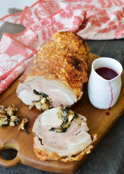 Это классический рулет из свинины, наполненный вкусной начинкой включая хлеб, бекон, чеснок и орехи, и будет главным блюдом на Вашем праздничном столе. Нам понадобится: Рулет 3 столовые ложки оливкового масла; 3 ломтика хлеба на закваске, нарезанный на кусочки по 1 см; 1 луковица, нарезанная кубиками; 2 ломтика бекона, нарезанные тонкими кубиками; 3 зубчика чеснока, раздавить; 100 гр. шпината (свежего или замороженного); 1 чайная ложка дижонской горчицы; 1/4 чайной ложки морской соли; молотый черный перец; приправы по вкусу; 35 гр. грецких орехов, мелко нарезанных; 125 мл. куриного или костного бульона; 2 кг. свиной вырезки; 2 лимона Малиновый соус 60 мл. красного вина; 150 гр. замороженной малины; 60 мл. куриного или костного бульона; 3 ст. л меда; ½ ч. л. молотой корицы (по вкусу); морская соль и свежемолотый черный перец Разогрейте духовку до 180°. В сковороде разогрейте 2 столовой ложки масла на умеренном огне и обжарьте хлеб до хрустящей корочки. Отложите в миску для смешивания Д