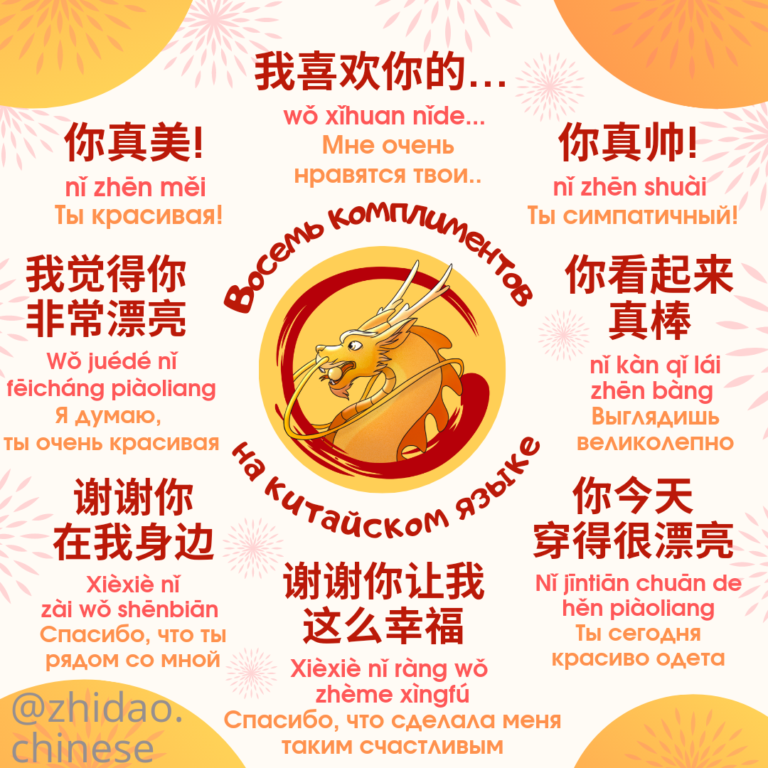 #zhidao_способы_сказать💭 Сегодня делимся с вами восемью способами сделать комплимент на китайском языке! 🥰 1️⃣ 我喜欢你的… wǒ xǐhuan nǐde... Мне очень нравятся твои… 📍Дальше можно подставить какие угодно слова, например, 眼睛 yǎnjing – глаза, 连衣裙 liányīqún – платье и т.д. 2️⃣ 你真美! nǐ zhēn měi Ты красивая (для обращения к женщине) 3️⃣ 你真帅! nǐ zhēn shuài Ты симпатичный (для обращения к мужчине) 4️⃣ 我觉得你非常漂亮! Wǒ juédé nǐ fēicháng piàoliang! Я думаю, ты очень красивая! 5️⃣ 你今天穿得很漂亮。 Nǐ jīntiān chuān dé hěn piàoliang. Ты сегодня красиво одета! 6️⃣ 你看起来真棒! Nǐ kàn qǐ lái zhēn bàng! Выглядишь великолепно! 7️⃣ 谢谢你让我这么幸福。 Xièxiè nǐ ràng wǒ zhème xìngfú Спасибо, что сделал(а) меня такой(им) счастливой(ым) 8️⃣ 谢谢你在我身边。 Xièxiè nǐ zài wǒ shēnbiān Спасибо, что ты рядом со мной 📝 Ссылка на карточки Quizlet для изучения новых слов: ❗В Quizlet вы можете послушать произношение всех фраз! Для этого нажмите на значок микрофона 🔊 📚 Хотите, чтобы Вы или Ваш ребенок заговорили на