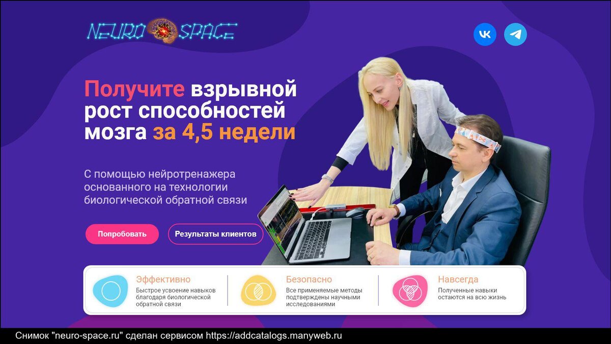 "НЕЙРО-СПЭЙС" Это научно обоснованный способ контроля, улучшения и развития мозга, управления эмоциями 1) Без медикаментов и внешнего вмешательства! 2) Вы сможете резко увеличить объём и скорость усвоения новых знаний! 3) Это комплексный подход, а не отдельно взятая методика! 4) Метод Биологической Обратной Связи - абсолютно безопасный метод, используемый в ведущих странах мира! 5) С помощью нейро-интерфейса мы просто показываем мозгу, в каком он состоянии. И мозг САМ подстраивается под оптимальный режим работы! НА ПЕРВОМ ЖЕ СЕАНСЕ ВЫ УЗНАЕТЕ, КАК ВАШ МОЗГ ВЛИЯЕТ НА ПОВЕДЕНИЕ, ХАРАКТЕР И ЖИЗНЬ!
