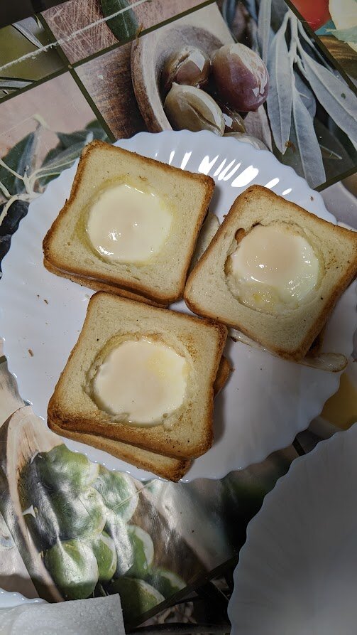 такой же только с сыром Быстро, легко и вкусно. В серединке тостового хлеба стаканом делаем дырку, если хлеб продолговатый вырезаем серединку, Обжариваем хлеб на скоророде с двух сторон и в середину заливаем яйцо, соль во вкусу и сыр тоже. Кому как нравится. Желаем вкуснейшего завтрака.