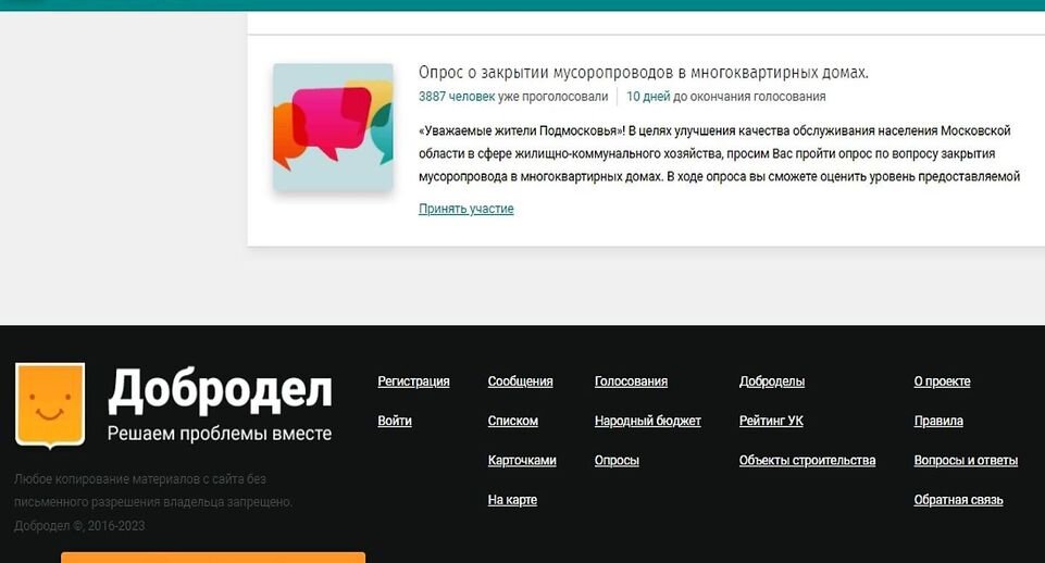 В Подмосковье стартовал опрос о демонтаже мусоропроводов в многоквартирных домах. Так, за неделю на «Доброделе» более четырех тысяч человек приняли в нем участие. Госжилинспекция Московской области отметила высокую активность жителей Балашихи, Люберец, Мытищ и Химок. На данный момент участники активнее выбирают графу «закрыть мусоропровод». Руководитель надзорного ведомства Ольга Федина подчеркнула, что основной причиной данного решения респонденты называют антисанитарию. При этом 61,3% проголосовавших оценивают содержание своего мусоропровода «удовлетворительно». За сохранение мусоропроводов проголосовали более 40% человек. Основными аргументами в его пользу выступают удобство и помощь маломобильным категориям граждан, а также пожилым людям. Опрос продлится до 14 апреля. Ранее губернатор Андрей Воробьев поручил разобраться с лужами на дорогах, прежде чем проводить ямочный ремонт. В противном случае, по его словам, это будет «мартышкин труд». Новости Подмосковья можно обсудить в «Супер