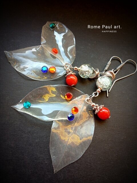 МАТЕРИАЛЫ: натуральный сердолик, богемское стекло-кракле, листочки из многослойного полимера с проклейкой стразами, посеребрённая фурнитура, швензы - ювелирная сталь