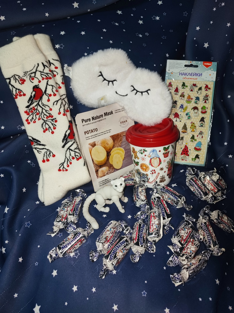 Второй подарок с обмена шел из Новосибирска, поэтому я забрала его только вчера (а еще там было чуть-чуть дополнительного заказа, поэтому его отправили позже). Составителем подарка является Алиса, владелица группы и организатор обмена. Несмотря, на то, что я не собиралась больше заводить БЖД, мне очень понравился "котик" и вот подарок у меня. Все хрупкое скрывается в термокружке). Темой подарка была зима. И тут все зимне-новогоднее, несмотря на весенний сезон. Хотя это у нас март весенний месяц, а в Новосибирске вполне себе зимний. В составе подарка БЖД котенок барса (фотополимерная печать), термокружка, носки, маска для сна, маска косметическая, наклейки и полкило очень вкусных конфет «Метелица» (особенно вкусных, оттого, что нельзя). Маска, котик и конфетки крупным планом. Любопытно, что в этот раз я отправила маску для сна и кроличьи ухи и получила маску для сна и ухи не кроличьи (в разных подарках). А что же был за заказ? Это был молниево-синий дракончик-шевеляш для моей подруги.