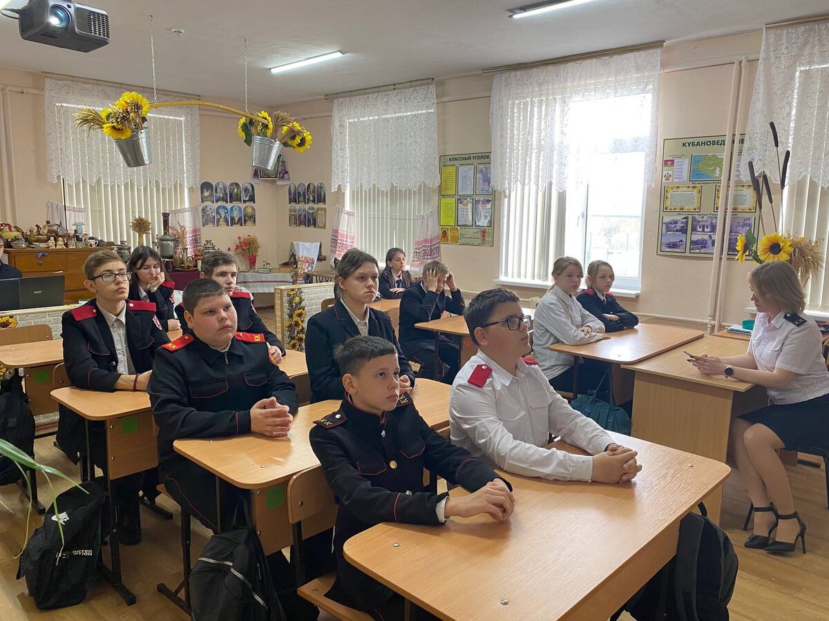 04.04.2023г По инициативе руководителя Союза казачьей молодежи (депутата СМД) Приморско-Ахтарского р-на старшего вахмистра Вадима Литовка, была организована встреча классов казачьей направленности с заместителем руководителя СКМ Приморско-Ахтарского р-на приказным казаком Александром Лысенко, а также в рамках соглашения о сотрудничестве Союза казачьей молодежи и ГосЮрБюро КК проведение онлайн лекции на тему: Экстремизм и терроризм: понятие и меры по противодействию. Лекцию провел главный специалист ГосЮрБюро Краснодарского края Алексей Артемьев. В данном мероприятии приняли участие в очном формате: казаки наставники ст.урядник Сергей Гоманов, руководители классов казачьей направленности, руководитель класса казачьей направленности МБОУ СОШ #1 Головенко Ольга, студент ГБПОУ КК ПАТИС приказный казак Маджиди Даниаль, волонтёры, заместитель руководителя Союза казачьей молодежи Приморско-Ахтарского района приказной Александр Лысенко. В дистанционном формате приняли участие: - МБОУ СОШ