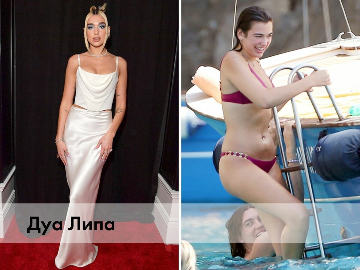 Например, Дуа Липа. На первом фото явно удачная поза: приподнятая голова, руки вдоль силуэта и вытянутая нога. Так певица кажется выше и стройнее. На второй фотографии она весело отдыхает с друзьями. Конечно, в своих соцсетях или на красной дорожке знаменитости стараются выглядеть на все сто. Но кому за камерами не хочется расслабиться и просто быть собой?