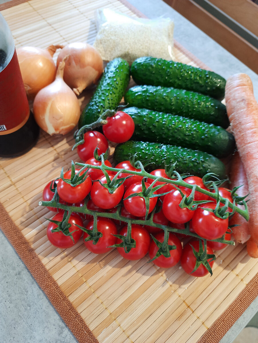 Нам понадобятся: * Огурцы свежие среднего размера 5 шт.; * Помидоры "Черри" 250 г.; * Морковь среднего размера 2 шт.; * Лук репчатый среднего размера 2 шт.; * Соевый соус 3 ст. л.; * Кунжут 2 ст. л.; * Масло растительное 20 г.; * Соль щепотка. 1. Почистим огурцы и нарежем соломкой. 2. Помидоры "Черри" режем пополам и добавляем к огурцам. 3. Морковь нарезаем соломкой, а лук полукольцами. 4. Порезанные морковь и лук подсаливаем, обжариваем на растительном масле до полной готовности на медленном огне. 5. Поджарку остужаем, добавляем в салат. 6. Добавляем в салат соевый соус, посыпаем кунжутом. Все хорошо перемешиваем. Салат готов!