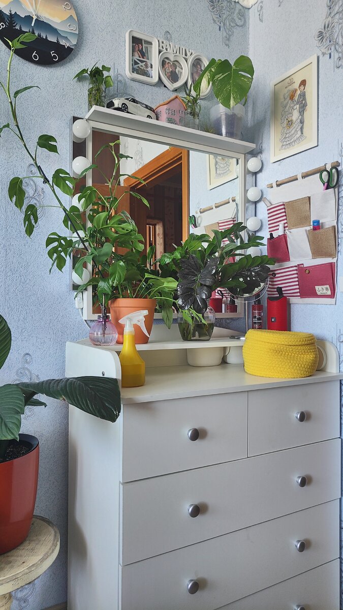 Привет! В этой статье я продолжу делиться своими озеленительными идеями и любимыми уголками с растениями. Сегодня на очереди спальня и детская. В последний год у меня появились дополнительные полочки и стеллажи для растений. Таким образом я экономлю место на подоконниках, а также создаю композиции. Комод в спальне многофункционален. Там не только вещи, но и косметические средства, а также цветы. Сейчас здесь стоит монстера Минима (но она убегает уже на стену) и укореняется замиокулькас. Вообще это детский пеленальный комод. А дополнительную полочку я не убираю, так как удобно расставить растения на ней. Сверху над зеркалом самодельная полка. Здесь у меня стоит монстера вариегатная и укореняются черенки. Одно время там стояла церопегия, и она очень красиво свисала своими плетьми💚💚 Рядом с комодом спатифиллум Сенсация. Кашпо стоит на табуретке. На днях поставила цветок в плетенную корзину. Так как делала некоторые перестановки. Далее, напротив кровати на стене висят сциндапсусы З