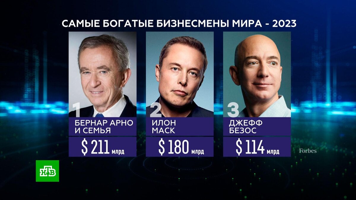 [ Смотреть видео на сайте НТВ ] В российской части рейтинга впервые лидирует основатель компаний «Еврохим» и СУЭК Андрей Мельниченко. Владелец французского производителя предметов роскоши LVMH Бернар Арно возглавил ежегодный рейтинг богатейших людей мира по версии Forbes, сместив Илона Маска, сообщает издание. Состояние Арно оценивается в $211 млрд. Он стал первым французом, возглавившим рейтинг. Основатель SpaceX Илон Маск на втором месте — $180 млрд. За год он стал беднее почти на сорок миллиардов. Forbes связывает это с покупкой Twitter — скандалы вокруг соцсети вызвали обвал акций его компании Tesla. Третье место у основателя онлайн-ретейлера Amazon Джеффа Безоса — $114 млрд. Минувший год вообще был неудачным для технологического сектора, Безос потерял почти 60 миллиардов. В российской части рейтинга впервые лидирует основатель компаний «Еврохим» и СУЭК Андрей Мельниченко — $25,2 млрд. Его состояние за год выросло более чем в два раза, удобрения сейчас в цене. Второе место занял гл