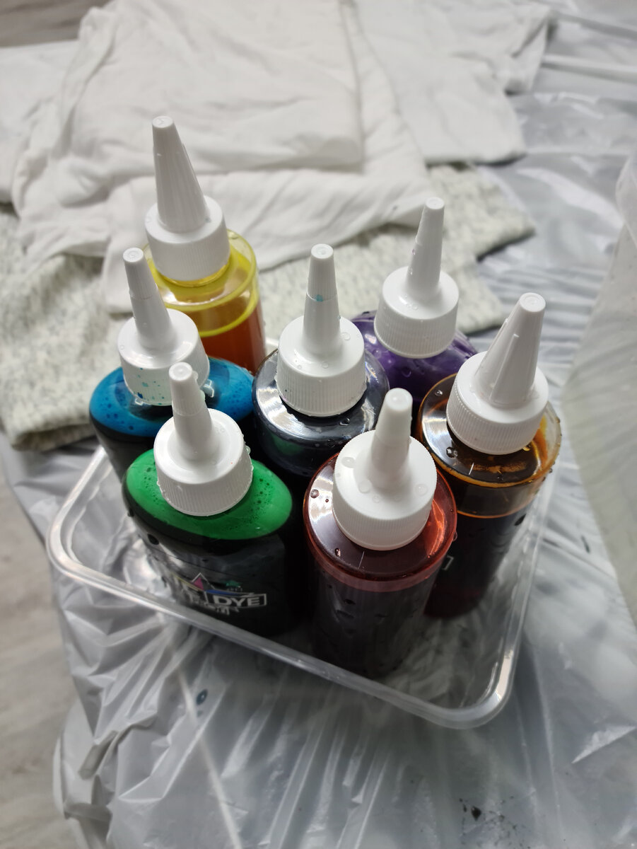 Стиль - ничто. Пока ты не заявишь о себе. Захотелось мне с детьми поэкспериментировать в окрашивании одежды. Выбор пал на технику "тай дай". Набор для "тай дай": - клеенка, перчатки - сухие красители, которые нужно развести водой и потом можно хранить до 2-х недель. Цвета разные и яркие. - активатор (карбонат натрия) необходим для закрепления краски на ткани. 250 грамм активатора необходимо развести в 5 литрах воды и в этом растворе выдержать не менее 20 минут изделие. Мы выдерживали больше - один раз 3 часа, один раз оставили на ночь. Когда активатор закончился, то в дальнейшем мы использовпли простую соду. Разницы в результате не увидели. Небольшая инструкция по созданию шедевра. Футболку можно свернуть разными способами , чтобы получить разные варианты рисунка - полоски, разводы, пятна и др. Мы решили свернуть спиралью. Находим центр футболки и накручиваем по спирали её на вилку, затем фиксируем резинками и разделяем тем самым на сектора, которые будем окрашивать в разные цвета