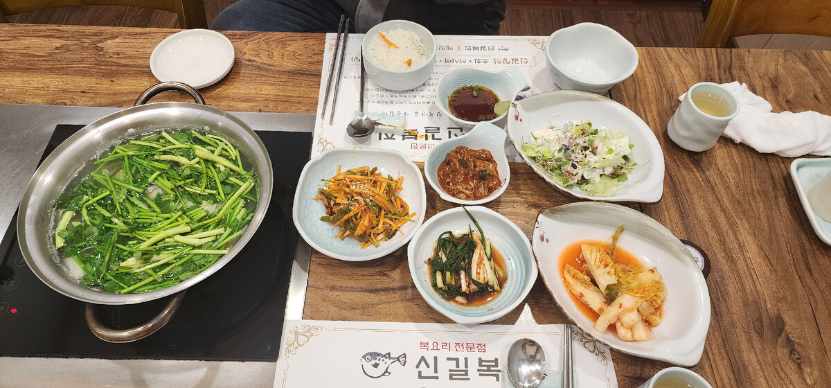 В самый мой первый приезд в Корею меня угостили очень интересным супчиком. Poison fish. Рыба Фугу. Сашими в японском ресторане я ещё могла представить. Но чтоб её вот так вот в суп! Впрочем ужин удался на славу. Теперь это одно из моих любимых блюд на ужин. Полностью в корейском стиле - остро, свежо, вкусно, необычно. Теперь по порядку. Сервировки обычная. Без особых изысков. Но! На столе 9 блюд (две порции риса в кадр не попали). Так сервировали стол для высоких персон. Не ниже потомственных дворян! Больше было только у королей - аж 12. Суп сам должен перед едой прокипеть на конфорке минут 5. А то ж это сама Фугу! Хотя я сильно подозреваю, что эта рыба да, настоящая Фугу! но выращенные в питомниках они имеют минимальное количество того страшного яда, от которого нет противоядия. То есть ядовитые, но немного) при разделке весь яд удаляется. Да и токсин коварно оставшийся в плоти рыбки от варки разрушается. Но нервишки пощекотать себе даже приятно) Как водится в корейской кух