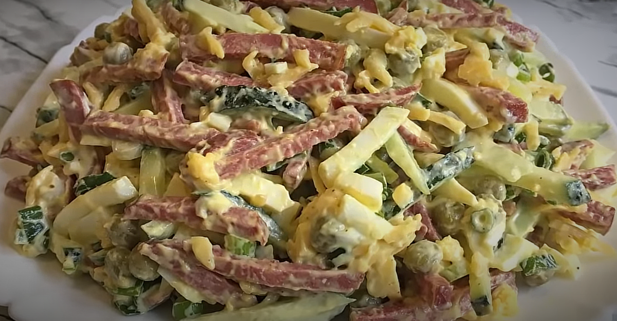 Друзья! В этой статье я вам подробно расскажу, как приготовить салат «Неожиданный гость». Салат имеет такое название, потому что он готовится очень быстро и легко, с использованием простых и доступных ингредиентов, получается очень вкусным. Надеюсь, салат понравится и вам и вашим гостям. Начинаем готовить: Подписывайтесь на мой канал, ставьте лайки, оставляйте комментарии, делитесь с друзьями. Ингредиенты: - копченая колбаса - 150 г; - огурцы свежие - 2 шт. (среднего размера); - вареные вкрутую яйца - 3 шт.; - сыр твердый (любой) - 80 г; - консервированный зеленый горошек - 100 г; - зеленый лук - 20-25 г; - соль, перец черный молотый по вкусу (по желанию); - майонез по вкусу. 1. Колбасу, огурцы, яйца нарезаем соломкой (сначала кружками, затем кружки соломкой). Зеленый лук нарезаем не очень мелко. Перекладываем нарезанные ингредиенты в салатник. 2. Сыр натираем на крупной терке, добавляем в салатник. 3. Добавляем консервированный зеленый горошек. Солим, перчим по вкусу
