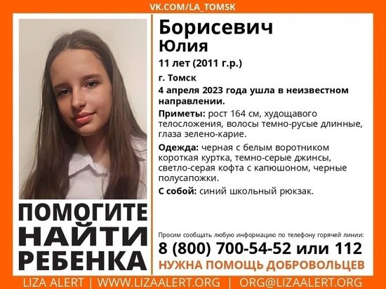 Сегодня, 4 апреля, в Томске пропала 11-летняя Юлия Борисевич. Девочка ушла в неизвестном направлении.