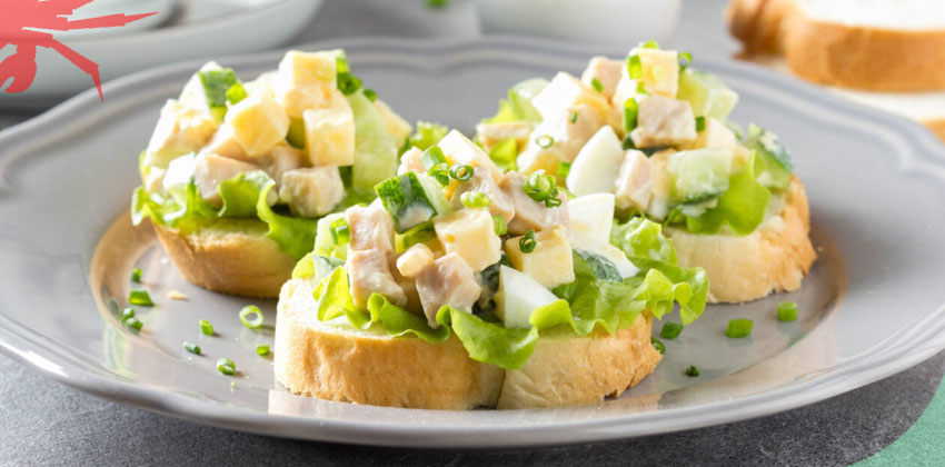 Ингредиенты: Для начала очищаем и отвариваем кальмары в подсоленной воде в течении 2 минут. Яйца отвариваем, даем им остыть, очищаем. Затем нарезаем кубиками кальмаров, яйца, сыр и огурцы. Измельчаем лук. Берем миску, смешиваем все ранее подготовленные ингредиенты. Солим по вкусу. Теперь нарезаем багет, на каждый кусочек кладем зелень, а сверху салат. Блюдо готово. Приятного аппетита! Источник: https://wildcrab.ru/news?id=1981