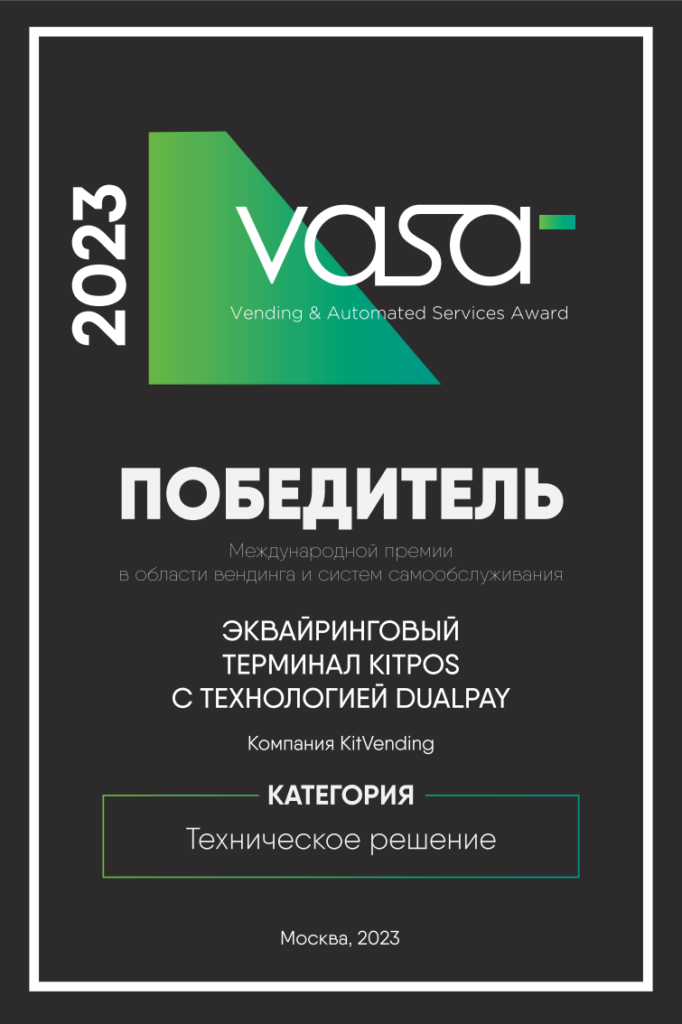 На прошедшей 21-23 марта выставке Versous 2023 были подведены итоги международного конкурса инноваций в вендинге и системах самообслуживания VASA 2023. Экспертное жюри, в состав которого вошли управляющие инновационными проектами, основатели стартапов и специалисты по высокотехнологичным интеграциям, определило победителей конкурса. Решение проекта KiT Vending «Эквайринговые терминалы KitPos с технологией Dual Pay» одержало уверенную победу, а решение «Микромаркет самообслуживания KiT Shop на базе банковского терминала Kit Shop Pos» заняло второе место. Компания «Кит Инвест» благодарит организаторов конкурса и жюри за высокие оценки и доверие. Проекты KiT Vending и KiT Shop в очередной раз подтвердили абсолютное лидерство на российском рынке. Диплом конкурса инноваций VASA 2023 Платежная технологи Dual Pay была не только отмечена жюри международного конкурса, но и вызвала массу положительных эмоций практически у всех вендинговых операторов. Что же такое Dual Pay, и почему она привлекла