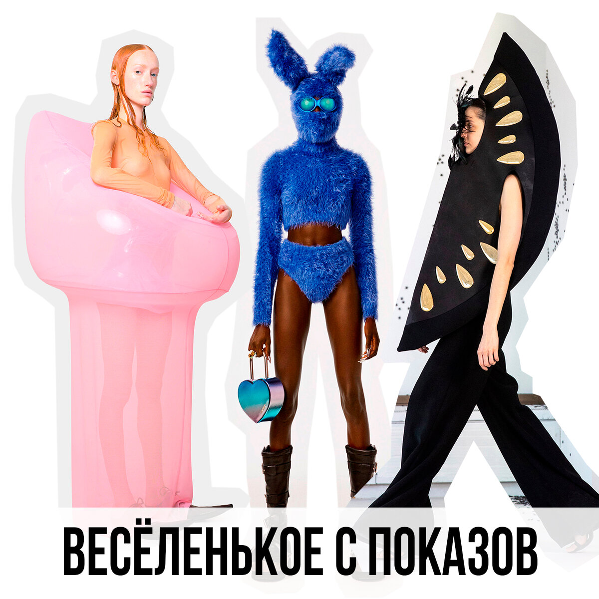 Здесь мы не ищем глубоких смыслов, а наслаждаемся свежей дизайнерской мыслью. 1–2 Заводные цитрусы бренда Area. Коллекция вышла фруктовая — кроме цитрусов были ещё баначики. 3 Ансамбль от бренда Roksana — похож на черную подушку и шикарное многослойное одеялко. 4 Patrick McDowell — здесь прекрасно все — башня из бигуди поместилась в капюшон, они идеально сочетаются по цвету. Чёрные шнурочки мэтчатся с бантами на рукавах, чёрные же гольфы дополняют ансамбль. Одного не пойму — при чем тут зелёные кеды в стразах) 5 Розовая штука от Melitta Baumeister прекрасно подойдет для бассейна. 6 А в чёрном образе платье и сумка вполне себе жизнеспособны. Но не обувь) 7 Thom Browne делает одежду, но ему бы в костюмы. В этот раз разошелся не на шутку. Рост Гвендолин Кристи из Игры престолов примерно 190см и тут она просто гора. 8 Отличный пример, как носить высокую причёску со шляпой. 9–10 Hodakova с платьями из брюк и лифчиков. 11–12 Comme des Garcons и так любят неносибельные объёмные вещи, а тут в