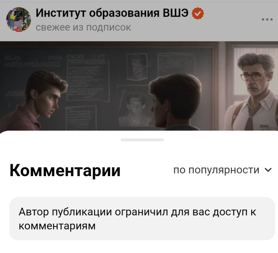 До сегодняшнего дня я комментировал этот канал в другой реинкарнации. Но после нескольких критических замечаний этот с позволения сказать институт с позволения сказать образования запретил мне комментировать его публикации. Причём ни на один комментарий никто даже не удосужился ответить. Просто обиделись. И вуаля - очистили канал от критической скверны. И ведь как это по либеральному! Прямо в духе ВШЭ - гнезда либерального мышления в России! Копируют под копирку (извините за тавтологию) лучшие либеральные технологии свободы слова! "Нам не нравится то что ты говоришь и мы затыкаем тебе рот!" Вы посмотрите что сегодня творится в либеральных СМИ на западе. Конечно их ставленники в России полностью следуют за ними! А что ж им ещё делать. Они ж ДЕНЬГИ от них получают. Они ж С НИМИ работают - вы хотя бы эту статью почитайте. И за ИХ деньги они проталкивают ТУТ ИХ ценности и методы. А тех кто не согласен блокируют в точности как ИХ западные "партнёры" (доноры, менторы, руководители). В СССР школьная психология давно изучила и разработала эффективные методы обратной связи учителя и ученика. Но в ЭТОМ "институте" СССР - это зло по умолчанию. И все кто критикуют ВШЭ и его структуры - это как мы видим тоже зло которое надо, ну если не уничтожить, то по крайней мере ограничить, заткнуть.