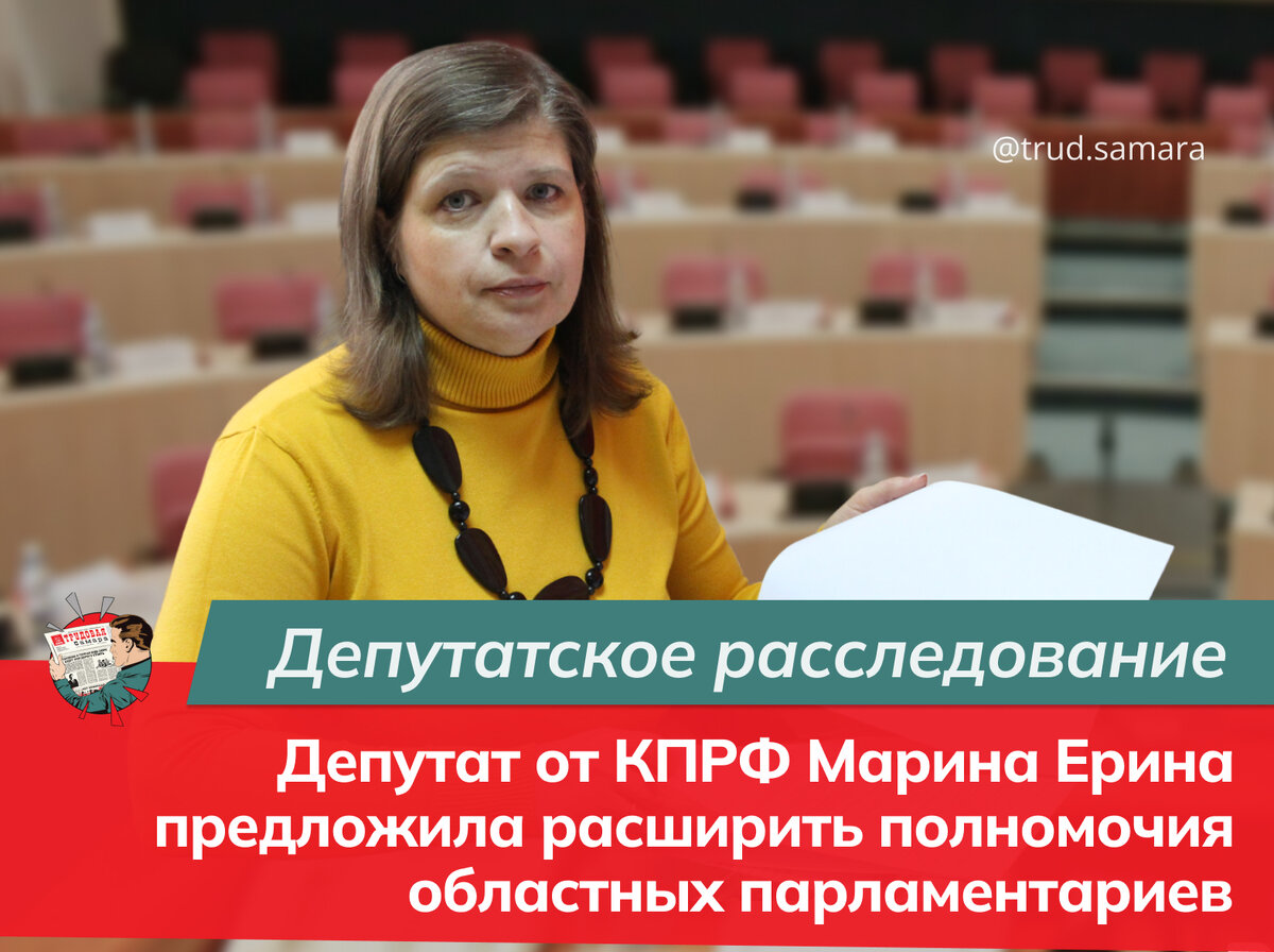 На заседании Комитета по регламенту Самарской Губернской Думы члены комитета обсудили возможность разработки регионального законопроекта в части введения норм о депутатском расследовании. С такой идеей выступила депутат фракции КПРФ Марина Ерина. В Самарской Губернской Думе состоялось заседание Комитета по регламенту. В повестке дня стоял вопрос об изучении возможности включения в Закон Самарской области «О статусе депутата Самарской Губернской Думы» возможности проведения депутатского расследования. С такой идеей выступила депутат фракции КПРФ Марина Ерина. В ходе обсуждения члены комитета рассмотрели заключение Главного управления правового обеспечения аппарата Самарской Губернской Думы, по мнению которого, такие поправки будут противоречить действующему законодательству. В итоге комитет, приняв к сведению заключение, принял решение: «Вернуться к рассмотрению данного вопроса в случае изменения федерального законодательства».