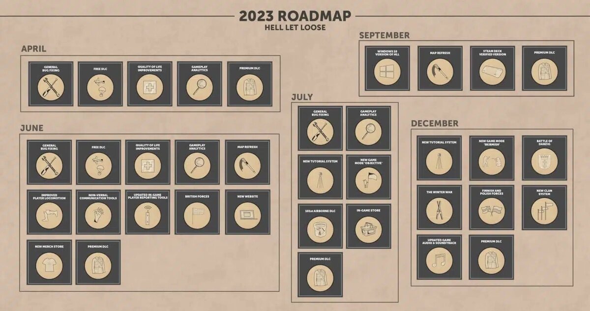 Компания Team17, которая занимается поддержкой Hell Let Loose с февраля этого года, представила фанатам многопользовательского шутера о Второй мировой войне свои планы по выпуску нового контента для игры в этом году. Основные обновления игроков ждут в апреле, июне, июле, сентябре и декабре. В эти месяцы поклонники шутера получат новые британские, польские и финские войска, игровые режимы, карты и клановую систему. Кроме них, игрокам стоит ожидать различные улучшения, новый магазин мерча и исправление ошибок. Подробнее о всех грядущих изменениях в Hell Let Loose, запланированных на 2023 год, разработчики рассказывают в новом видеоролике, где также показывают изображение с дорожной картой игры. https://www.youtube.com/watch?v=DJqh61nfuTs
