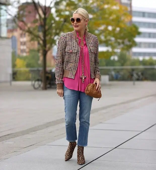 - Джинсы плюс твидовая куртка-жакет – получится современный и стильный комплект. В примере – светло-синие, немного укороченные джинсы, розовая свободная блузка, надетая навыпуск и короткая твидовая куртка-жакет со вставками из трикотажной резинки. Еще один эффектная деталь – ботильоны с леопардовым принтом.