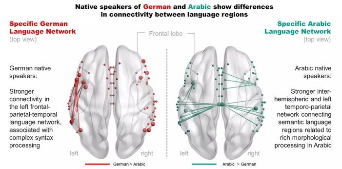 Исследовательский Институт Макса Планка опубликовал результаты недавнего исследования с помощью МРТ. Учёные искали различия в активности коры головного мозга у носителей арабского и немецкого языков. Оказалось, что она существенно различается. Посмотрите картинку у поста, я сейчас объясню. У немецкоговорящих испытуемых наиболее активна часть левого полушария, ответственная за грамматику. У немецкого языка такая структура, что каждое слово в предложении стоит на строго определённом месте, а ещё слова, связанные друг с другом по смыслу, могут оказаться в разных концах предложения. Такой сложный синтаксис и поддерживается этой зоной мозга. У носителей арабского языка более активна правая часть мозга и наблюдается интенсивная связь между полушариями. Активность правого полушария вызвана сложным звучанием языка, и отсутствием гласных в словах на письме. Для того, чтобы понять, как читать слово, которое написано одними согласными, надо иметь изрядный словарный запас и держать в голове контек