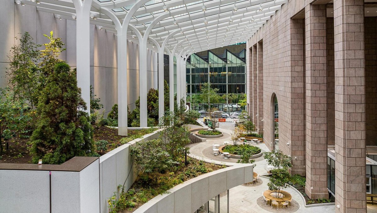 Архитекторы бюро Snøhetta превратили постмодернистский небоскреб, который раньше принадлежал компании AT&T, в современный бизнес-центр с собственным садом Небоскреб 550 Madison был построен в 1984 году для телекоммуникационной компании AT&T. Тогда здание, спроектированное Филипом Джонсоном (Philip Johnson) и Джоном Берджи (John Burgee), вызвало бурные дискуссии и ознаменовало переход от модернизма к постмодернизму. Его отличительной чертой стал треугольный фронтон с круглой выемкой, который придал башне сходство с мебелью английского дизайнера эпохи рококо Томаса Чиппендейла (Thomas Chippendale). За это небоскреб так и прозвали — «Чиппендейл». После AT&T здание заняла компания Sony, а затем его приобрела инвестиционная фирма The Olayan Group, которая решила превратить его в бизнес-центр. Ключевой задачей студии Snøhetta было сделать общественные пространства на первых этажах башни более открытыми: с западной стороны здания дизайнеры добавили новые окна, весь оставшийся после этого каме