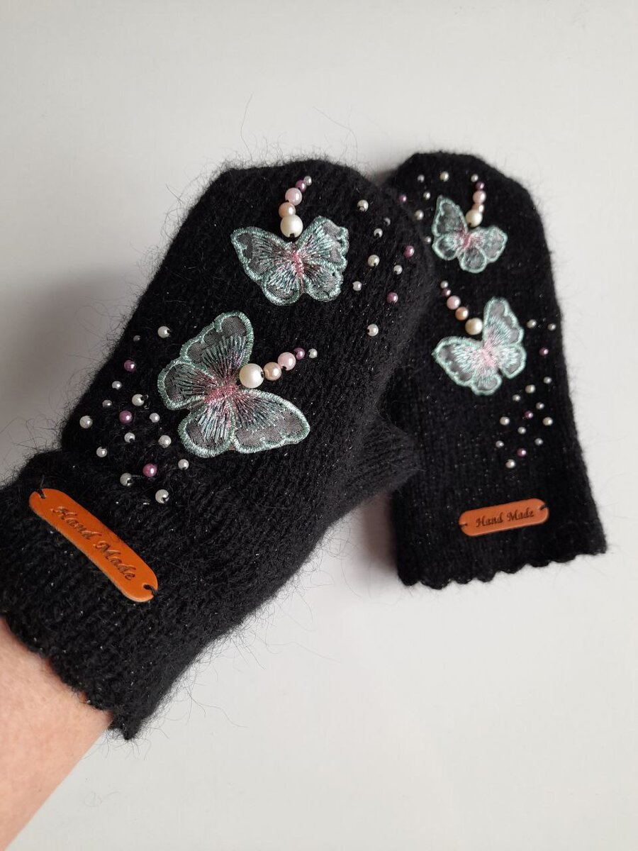 Варежки "Мотылёк ". Связаны спицами, материал шерсть с кидмохером. Рукавички двойные, очень тёплые . Украшены вышитыми бабочками, бусинами.