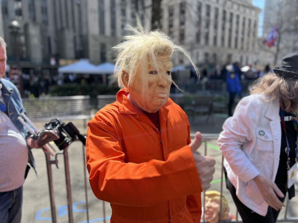 К 10 часам утра протестующие с обеих сторон захватили парк Коллект Понд через дорогу от здания суда, многие из них ждали прибытия Грин. Один человек одет в оранжевый комбинезон и маску Трампа на Хэллоуин.