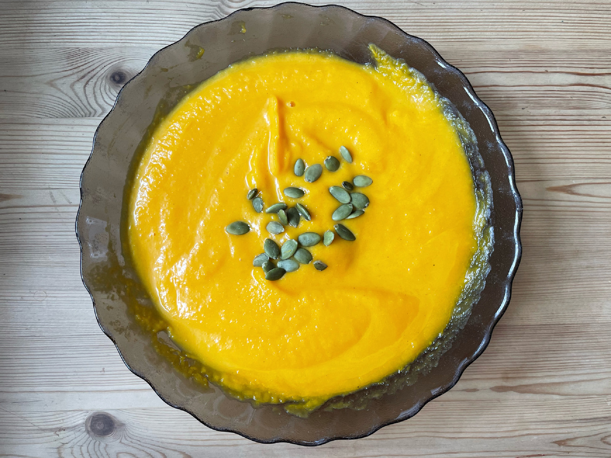 Привет 👋🏻 Ловите рецептик быстрого супчика пюре. -Половинка тыквы -Небольшая луковица -1 морковь -чеснок пару зубчиков -сливки 20% Нарезаем лук на полукольца и обжариваем в кастрюле на топленом масле. Туда же добавляем чеснок, заранее раздавленный боковой стороной ножа. Трем морковь и добавляем обжариваться в кастрюлю. Туда же тыкву, порезанную на кубики. Все вместе обжариваем минут 5 и добавляем воды, так чтобы покрыло овощи. Варим минут 20 (тыква должна стать мягкой), солим, перчим по вкусу. Добавляем немного сливок, чтобы суп не получился слишком жидким. И для вкуса можно добавить чайную ложечку лимонного сока. Снимаем все с огня и взбиваем погружным блендером, до однородной массы. Супчик готов. В тарелке можно украсить тыквенными семечками или зеленью по вкусу)