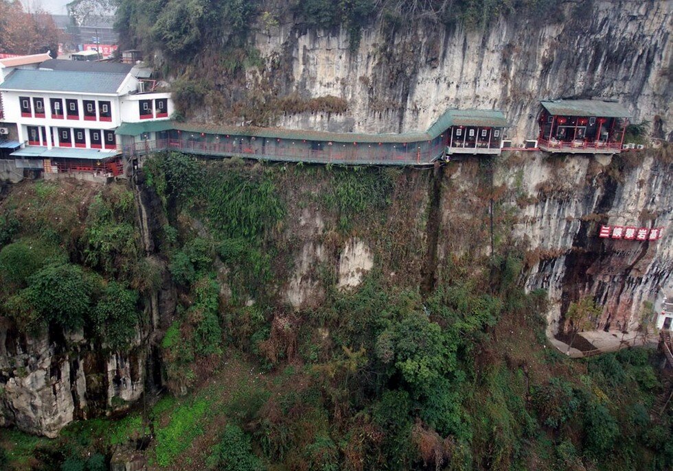 Fangweng – ресторан в Китае, который обустроен на отвесной скале. Эта особенность делает Fangweng одним из наиболее необычных ресторанов в мире, ведь согласитесь, что выпить чашечку кофе в ресторане, подвешенном над пропастью, получается не каждый день. Необычное, интересное и запоминающееся место помимо экстремальных ощущений подарит возможность полюбоваться красотой окружающей природы. А там есть, что посмотреть. Ресторан, «парящий» над землей, разместился неподалеку от достаточно известной пещерой в Киетае - Sanyou, в переводе с китайского обозначаемая как «Пещера трех странников». Пещера располагается в Ичане (Yíchāng), в провинции Хубэй (Hubei), Китай. Ресторан построен полностью на отвесе скалы, что дает иллюзию “парения” над рекой Янцзы на достаточно большой высоте. Чтобы добраться в этот ресторан, необходимо пройти по высоко висящему над пропастью отвесному мосту. Помещение ресторана разделено на две части: внутри пещеры разместился основной зал, а небольшой скальный уступ, вых