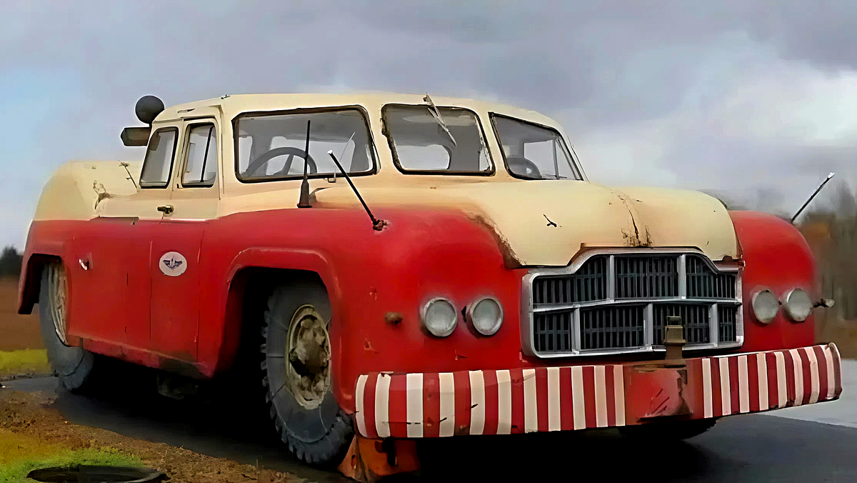 Трансмиссия тоже была под стать – механическая КПП фрикционного типа с 6 передачами: 3 вперед и 3 назад. Полный привод 4×4 с возможностью отключения переднего моста. А колеса использовались разного диаметра: спереди 15,00-20" от ЯАЗ-214, сзади огромные 17,00-32" от карьерного самосвала МАЗ-525. Такая комбинация обеспечивала отличное сцепление с бетоном и максимальное тяговое усилие.