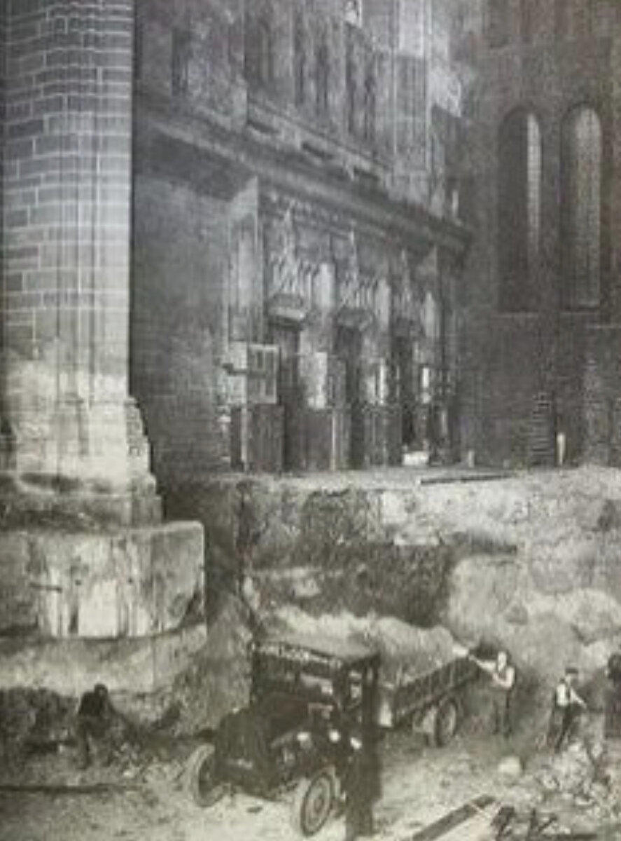 Рабочие сняли полы, потом пришлось снимать еще около 7м грунта, пока, наконец не дошли до фундамента постройки. Видимо, изнутри собора культурный слой нарос