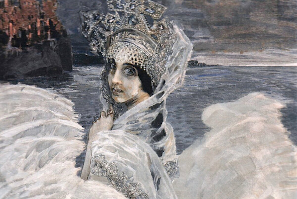 Вообще-то наша главная цель - Царевна-Лебедь. Сказку мы зачитали до дыр, и жаждем именно её. Вот она. Какая-то неземная красота, если перья заменить на оклад - получится Богородица византийского письма со скорбными глазами мученицы. (Кстати, а какие должны быть глаза у Царевны-Лебеди? Гвидон куражился и кочевряжился, требуя то того, то этого, и даже женился на ней, чтобы добиться-таки встречи с нерадивым папашей!) Всего этого я, однако, не говорю, мы вспоминаем слова из сказки о царе Салтане, когда вдруг неожиданно Софронида интересуется :