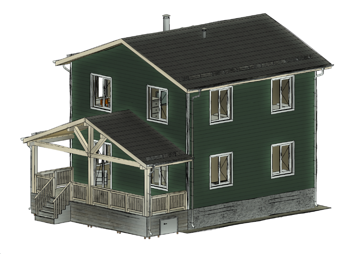1. Коробка и кровля, с навесами для террасы и крыльца, деревянное перекрытие и утепление (толщина 250 мм), черновой пол из фанеры: