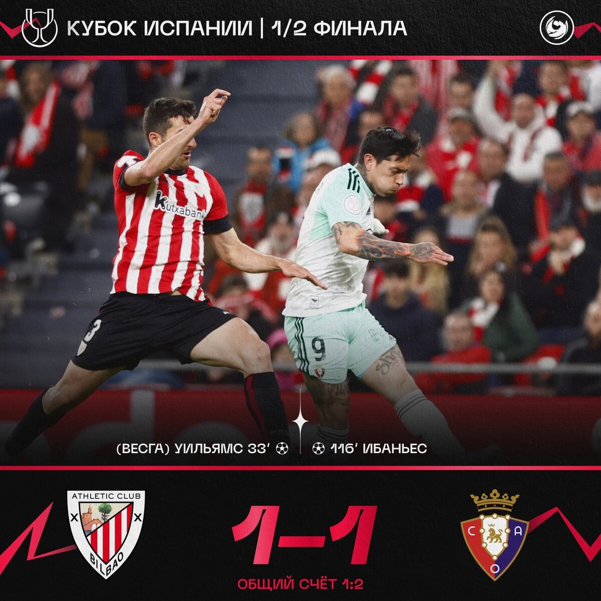 ФУТБОЛ: Кубок Испании. 1/2 финала. «Осасуна» выбила «Атлетик» Первый матч закончился 1-0 в пользу Осасуны. Второй матч проходил на «Сан-Мамес». Преимущество басков было солидно: владение мячом состовляло 62%, по ударом 9-2, угловые 6-0, опасные атаки 39-6. Но сумели забить только один мяч и это сделал Иньяки Уильямс на 33 минуте матча. Второй тайм происходил уже с меньшим преимуществом Басков. Только по ударом у них преимущество. Игра перевелась в дополнительное время где Атлетик снова начел душить Осасуну. Но на 116 минуте Ибаньес сделал счет в игре 1-1, а противостояние 1-2.
