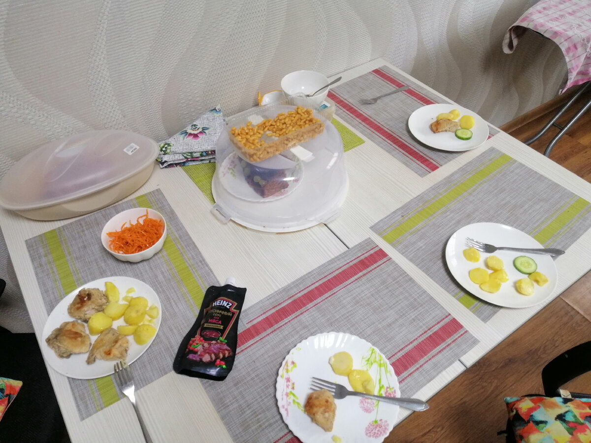 Здравствуйте, дорогие Друзья😍 Наконец и к нам в Заполярье пришла долгожданная весна. Слякотно, грязно, но главное другое. Нвдоевший снег почти растаял и сегодня утром пошёл первый настоящий дождик в этом году. Сегодня на обед разделала куру. Птичка была небольшой, а потому не стала откладывать грудку на потом. Все части замариновала в сметане с добавлением соли и чёрного перца. Мариновать получилось недолго. Примерно минут 30, но даже этого времени хватило, чтобы курица хорошо пропиталась. Кстати, специи можно добавлять любые. Курицу обжаривала и протушивала в глубокой сковороде. Кореи мы не любим, а потому всегда оставляю мясо мягким. Из- за кислинки сметаны мякоть получилась немного рыхлой. Но мы так тоже любим. На гарнир будет отварной картофель и морковка по- корейски. Теперь касаемо вчерашнего шоколадного пирога. Кто спрашивал, ловите рецепт. Нам понадобитс: 200 мл воды 40 мл подсолнечного масла 40 гр какао- порошка 200 гр пшеничной муки 1 ч. ложка пищевой соды 150 гр са