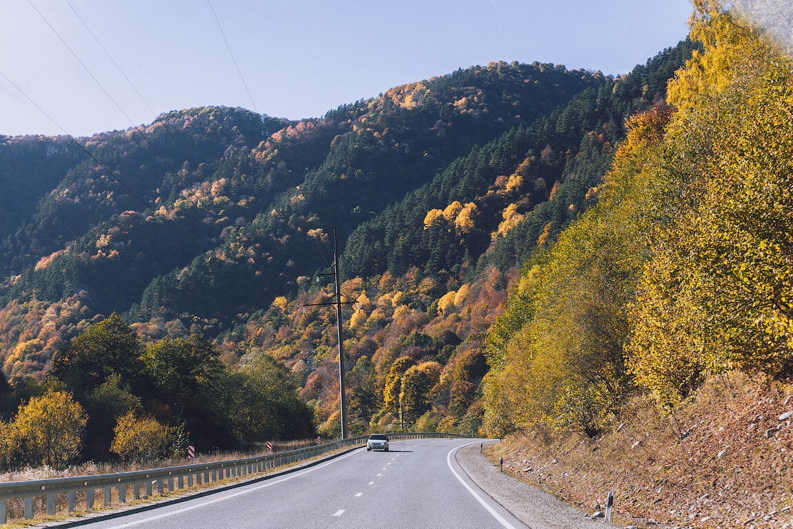 Когда мы выезжали из Воронежа, погода в наших краях стояла прохладная и дождливая. Получая пропуска в Черкесске мы ежились от ветра и невесело поглядывали на свинцовое небо, вот-вот готовое закрапать мелким дождем. Но в душе я надеялась на сказку солнечных горных ущелий, пестрых деревьев на склонах, короче говоря, я желала увидеть настоящую золотую осень. Так вот стоило нам только проехать сумрачные деревушки Даусуз и Нижняя Ермоловка, как облака постепенно стали рассеиваться, а вдали коридора из горных вершин показалось ярко-синее небо.