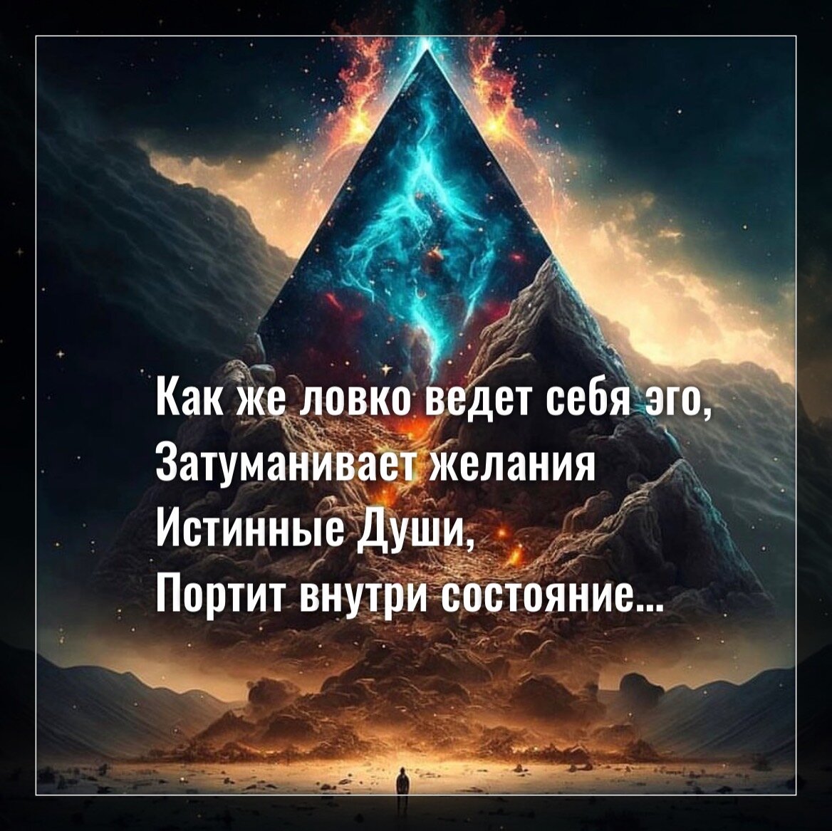 Как же ловко ведет себя эго, Затуманивает желания Истинные Души, Портит внутри состояние. Кажется мир рушится От безобидного действия, Легко наломать дров, Из-за эмоций воздействия. А Душа много в жизни не ждёт, Она только благодарит За то, что опять на Земле, За то, что делом горит, За то, что встретила Души, Роднее которых нет, За то, что они могут вместе На Земле увеличивать свет, А Небо их не предаст, Всегда будет оберегать, Не позволит без повода мучаться, И без поддержки страдать. Душе давать важно слово, Отпуская ненужные мысли, Вспоминая про благодарность, Поддержит в ответ Всевышний.